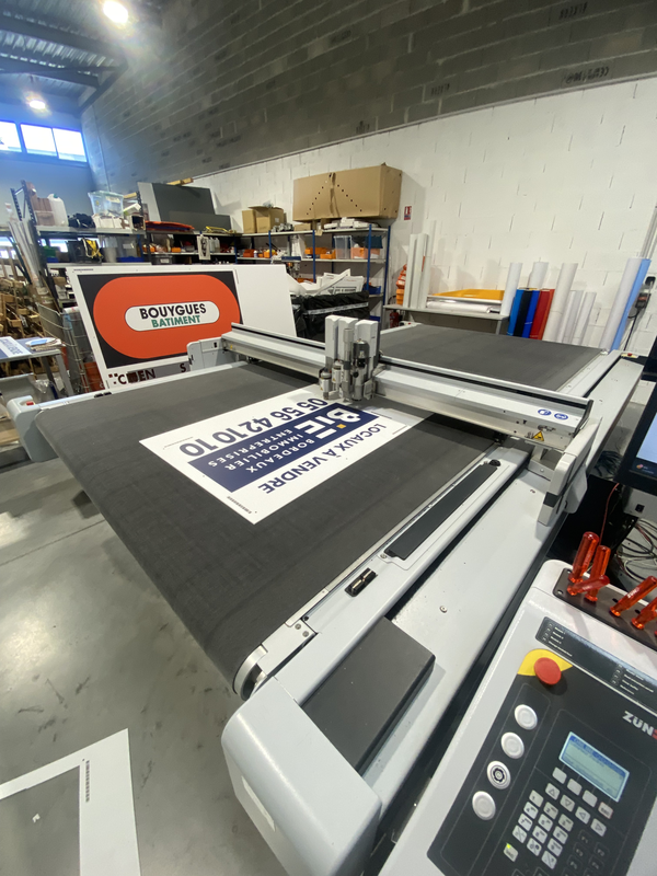 La zünd est une machine de découpe qui permet de découper toutes sortes de matériaux comme l'adhésif, le Dibond, l'akylux ou encore l'akyplax.